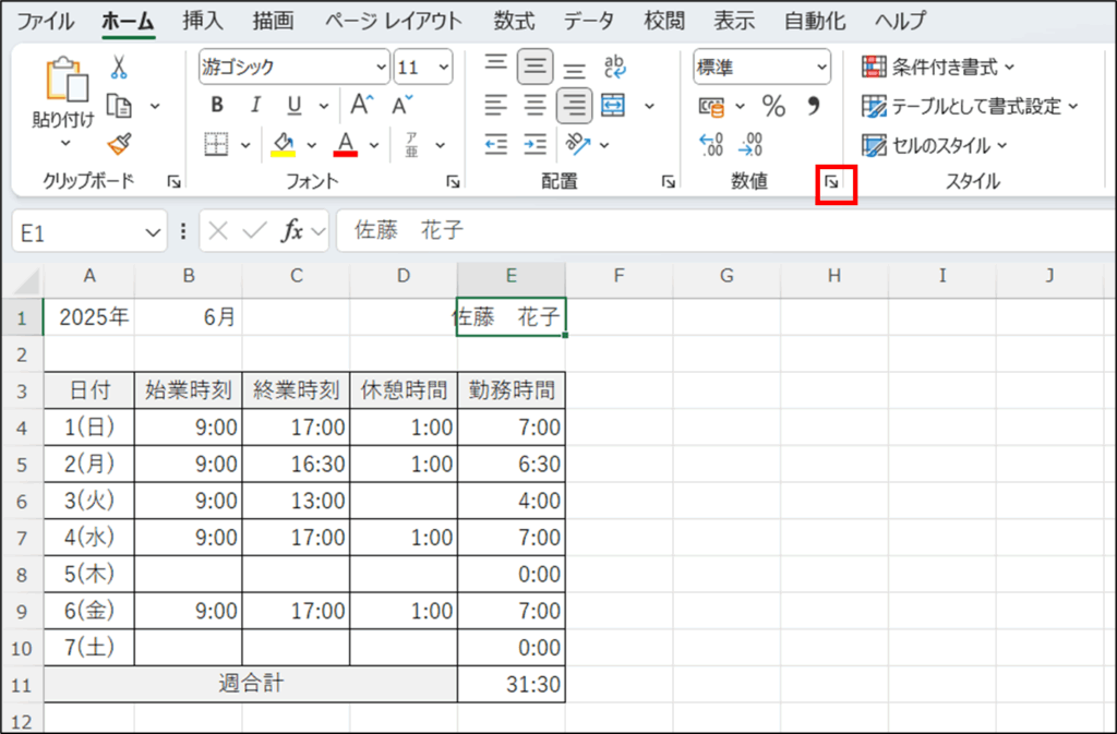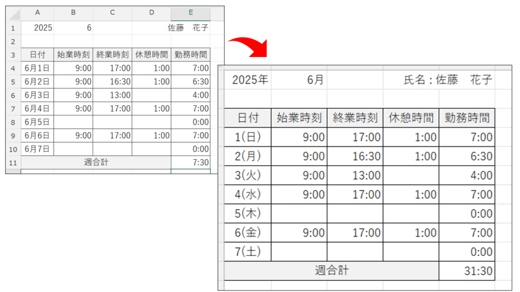 今回は、勤怠表を作成しながら、曜日や24時間を超える時間を表示させる方法を解説します。