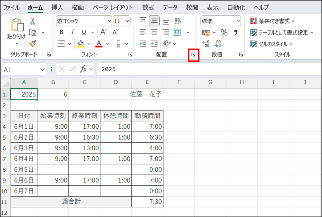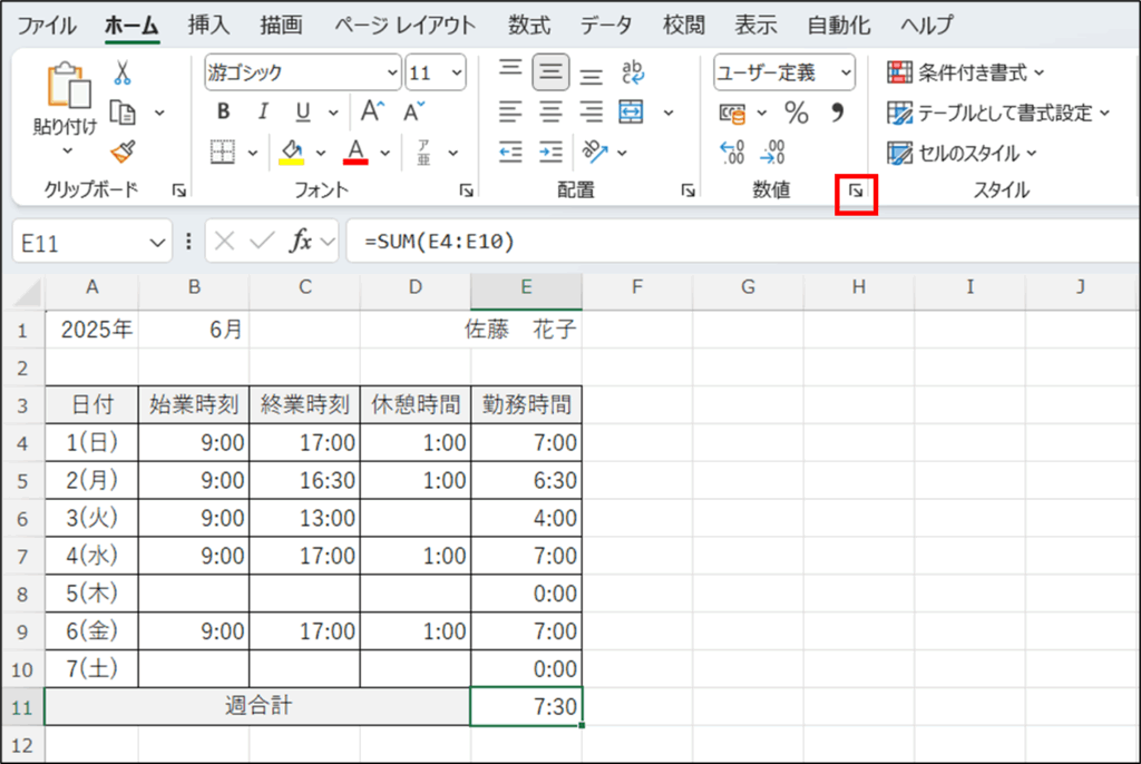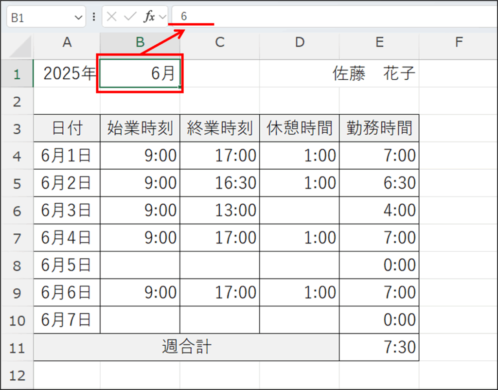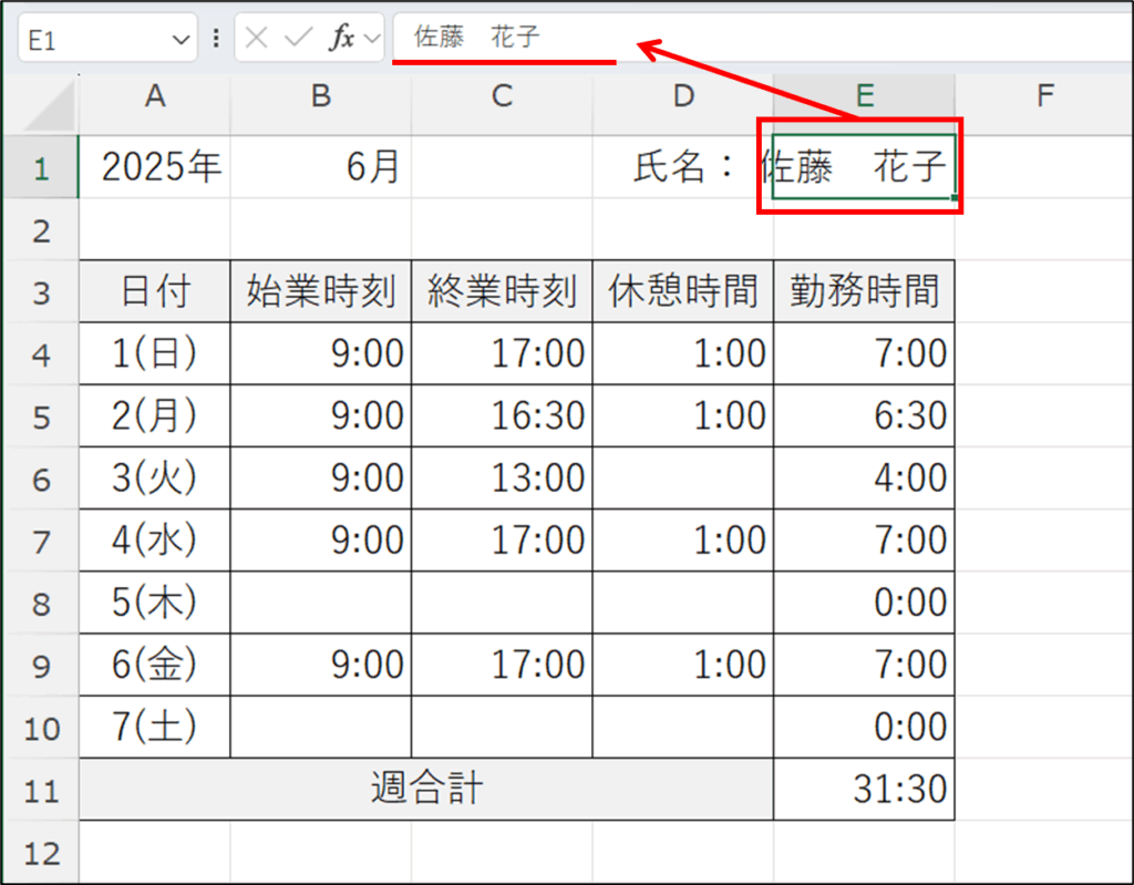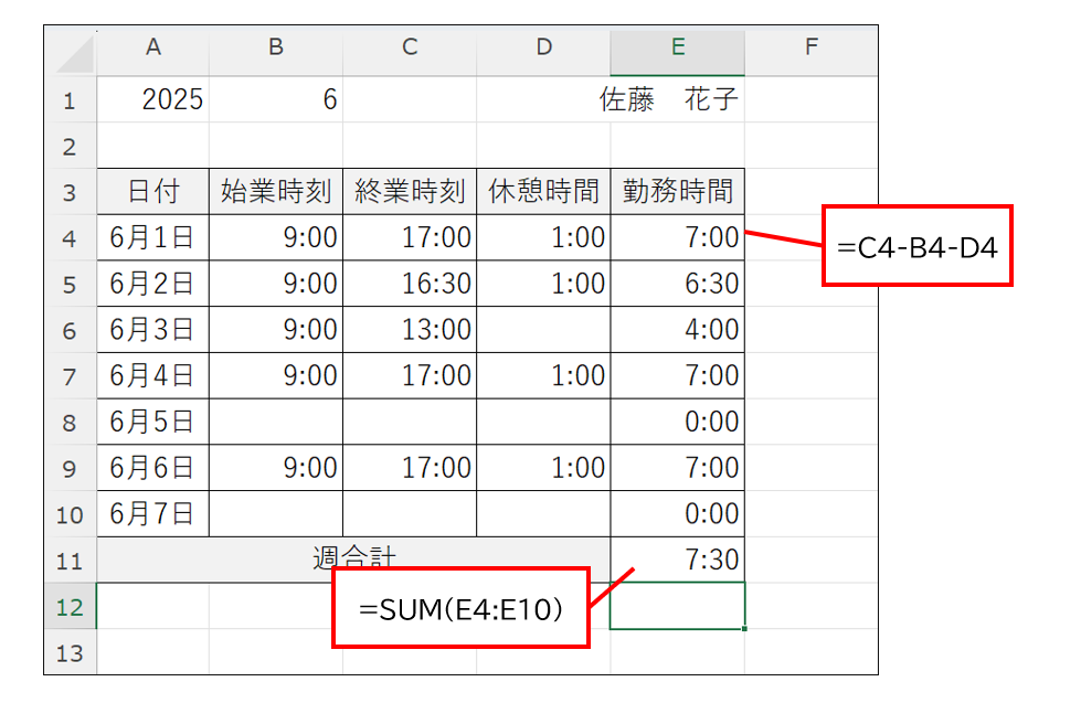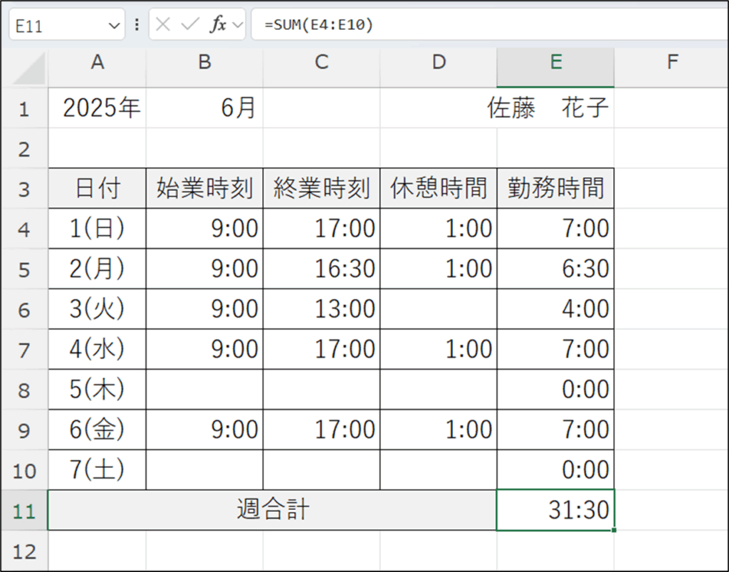 始業時間、終業時間、休憩時間を入力したら、勤怠表の勤務時間と週合計を求めます。