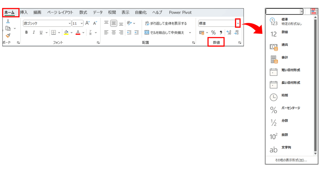 基本の表示形式は、[ホーム] タブの [数値] グループにある [数値の書式] で行います。