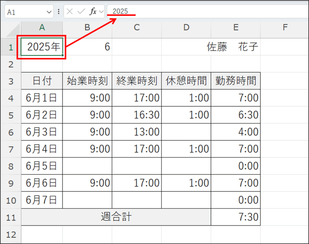 「2025」を「2025年」、「6」を「6月」の表示にします。