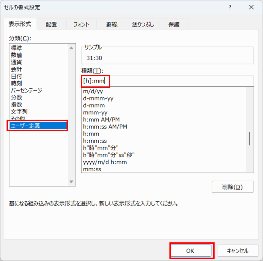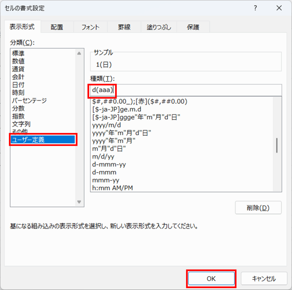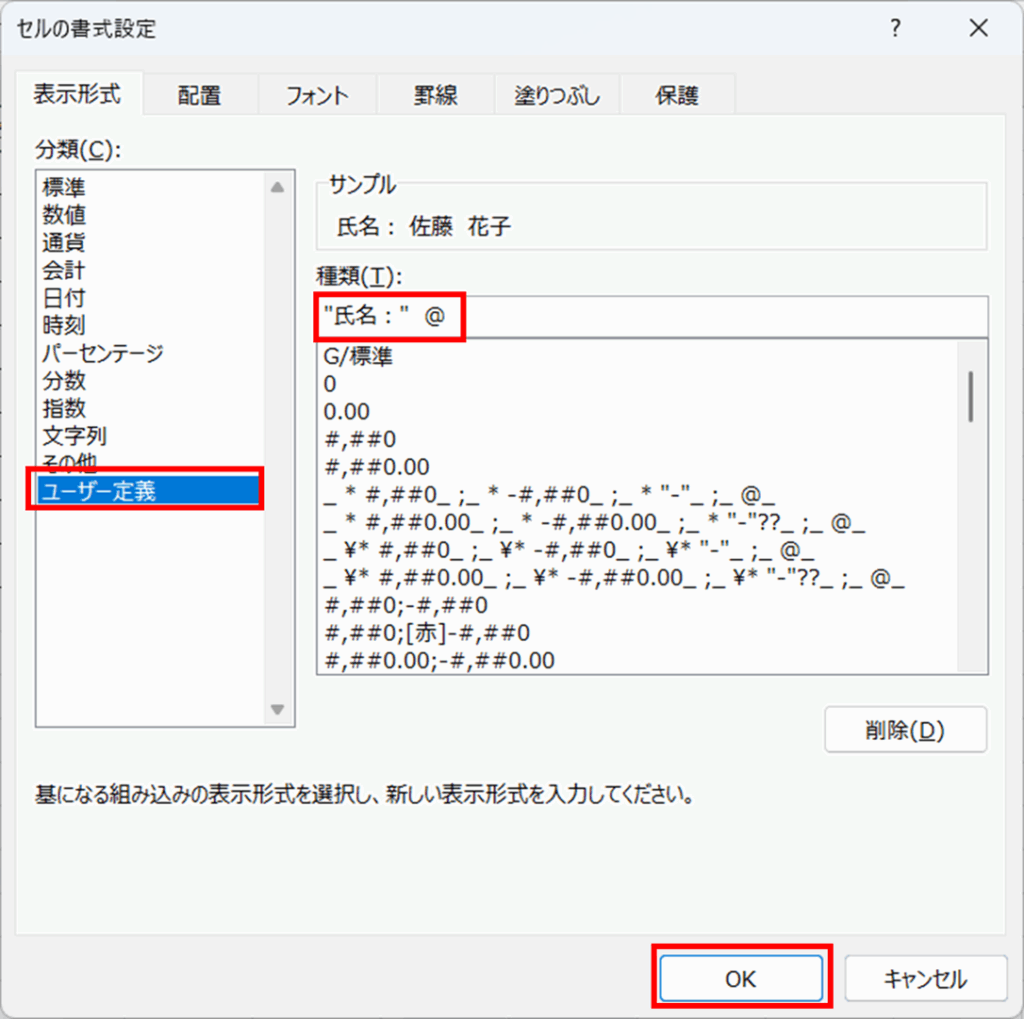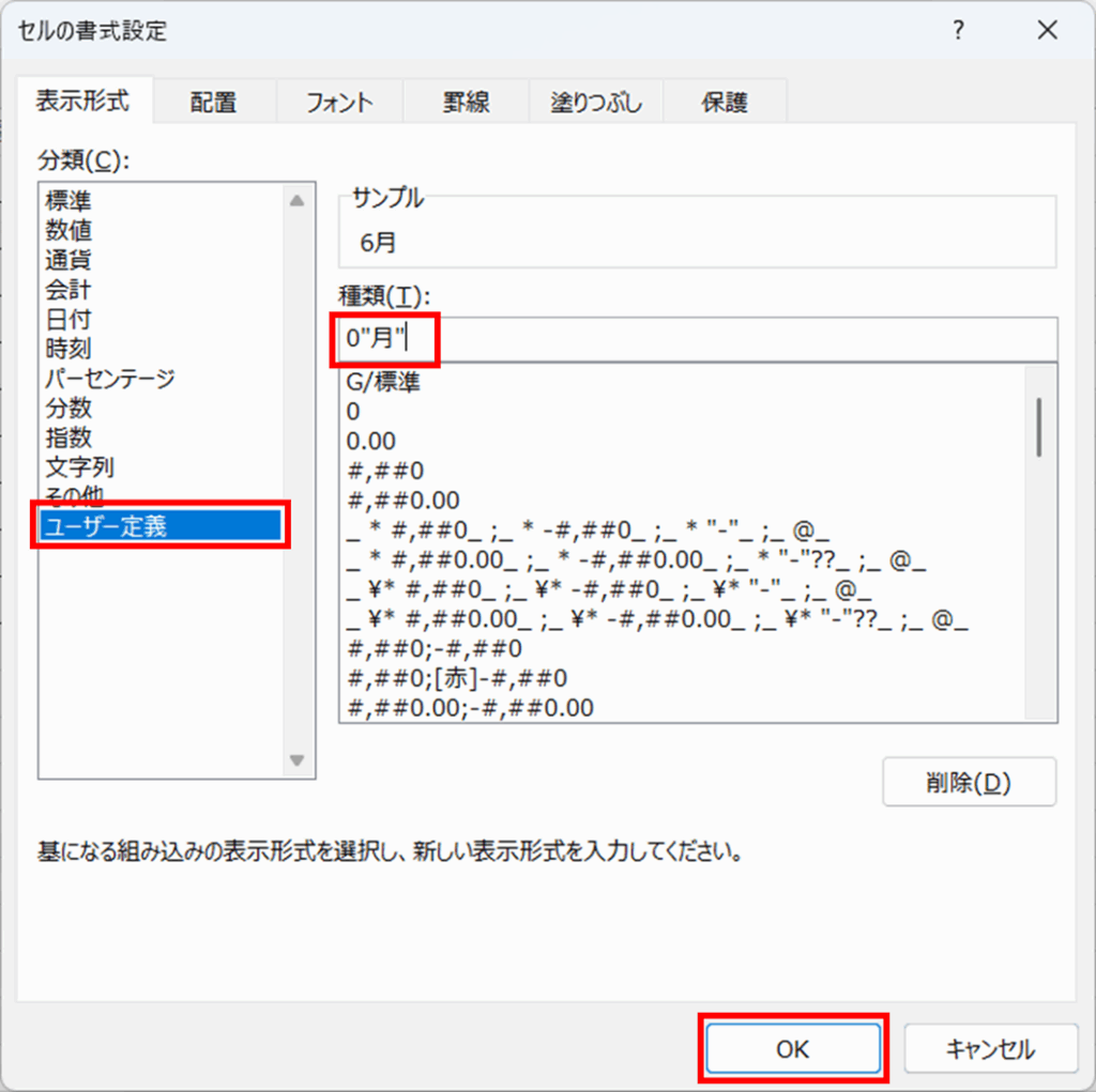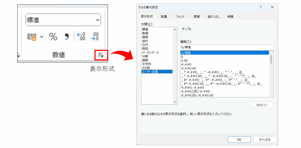 [表示形式] タブの [分類] にある [ユーザー定義] を選ぶと、右側に [種類] という入力欄が表示されます。ここに表示形式を直接入力するか、下の一覧から選択します。