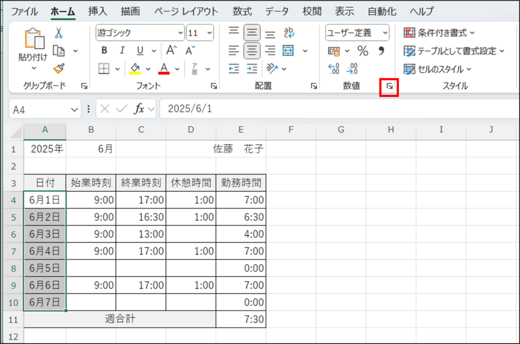では、ユーザー定義の表示形式を活用して以下のような勤怠管理表を作成してみましょう。