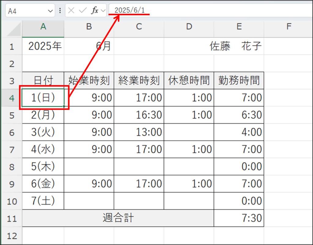 セル【A4】は「1(日)」と表示されました。