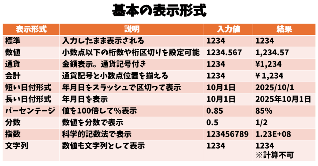 表示形式とは、セルに入力されたデータの「見た目」だけを変える機能です。