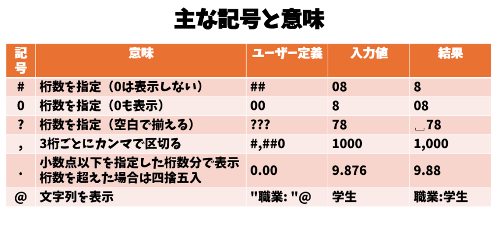 例:「0.00」と定義 → 入力値「9.876」は「9.88」と表示 「@」:セル内の文字列を表示。文字列はダブルクォーテーション「”」で囲んで表示。