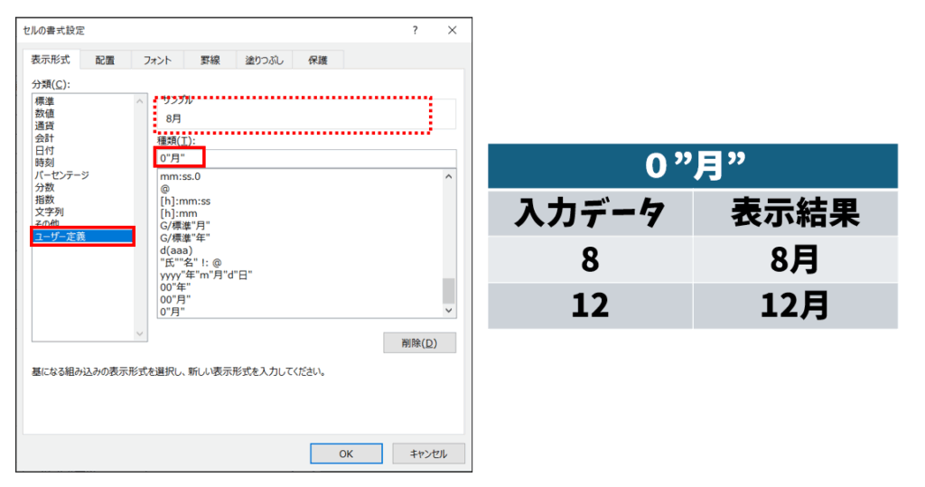 「0“月”」と定義すると、数値の後ろに「月」が表示されます。これは、「数値を最低1桁で表示し、後ろに月を付ける」という意味になります。