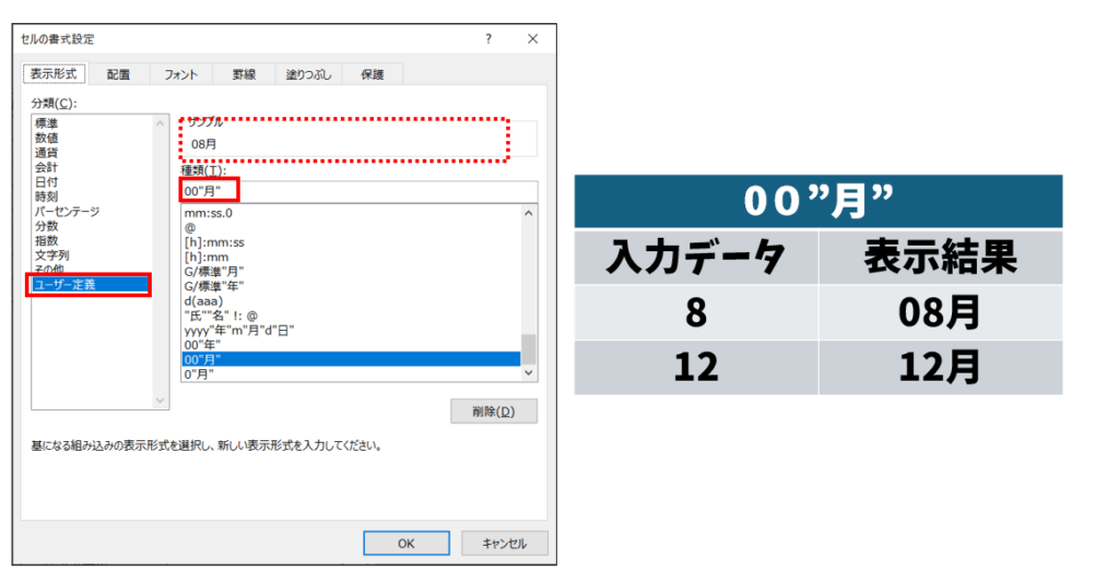 また、「00“月”」と定義すると、「数値を最低2桁で表示し、後ろに月を付ける」という意味になります。