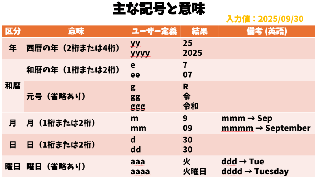 日付で使用する主な記号にはそれぞれ役割があります。代表的な記号と意味は、以下のとおりです。