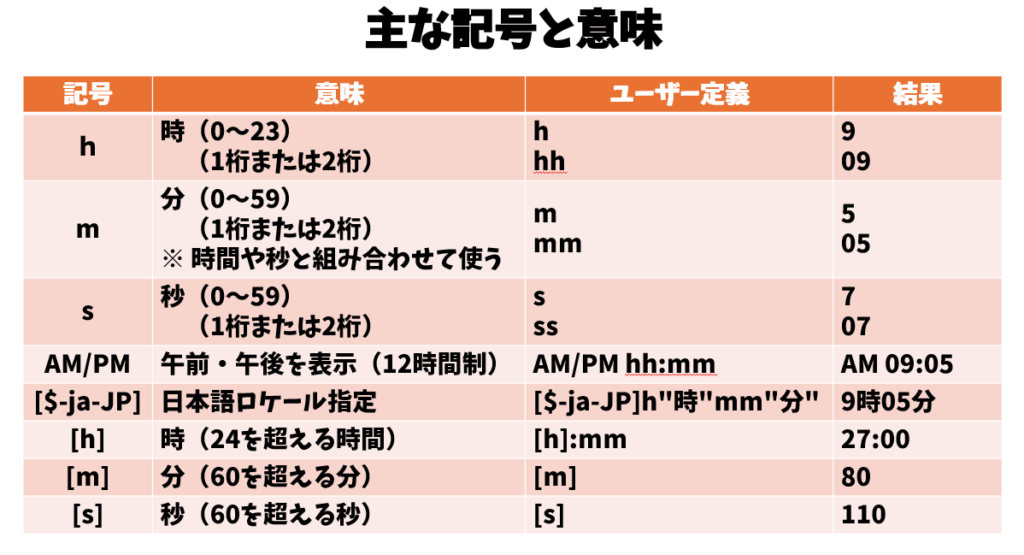 例「[$-ja-JP]h”時”mm”分”」と定義→「9時05分」と表示